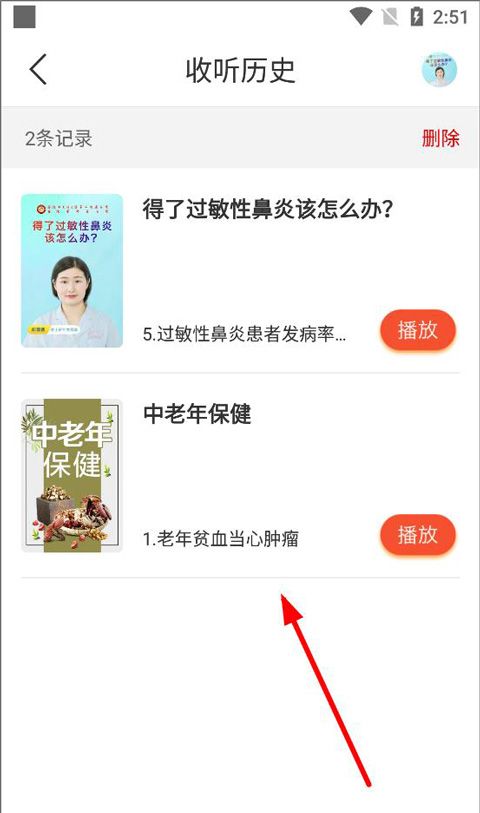 2、进入收听历史页面即可查看收听音频、视频、栏目记录(可删除相关记录);