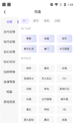 2、进入“书城”点击“书库”,通过各个大小分级标签定位感兴趣的小说类型