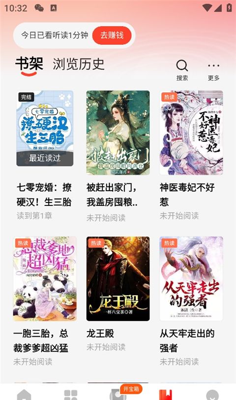 9、进入书架界面,可以快速打开自己想要阅读的书籍和查看自己已经看过的书籍,