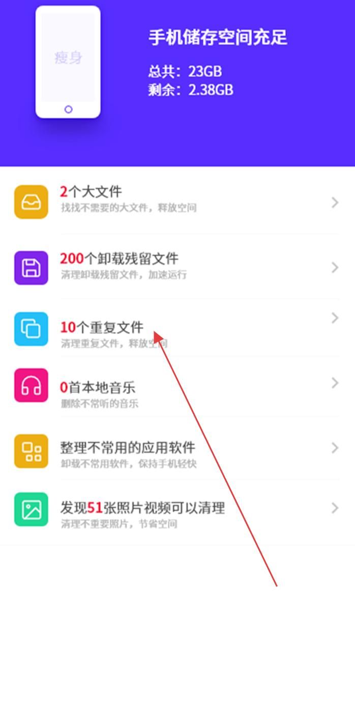 3、手机储存空间界面,显示总容量、剩余量,列出大文件、卸载残留等可清理项,箭头指向10个重复文件待处理。