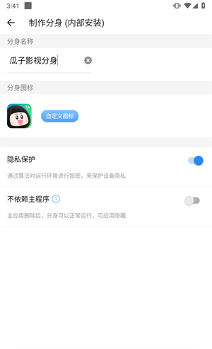3、之后自定义分身的名称、图案,以及可以自定义设置隐私保护。