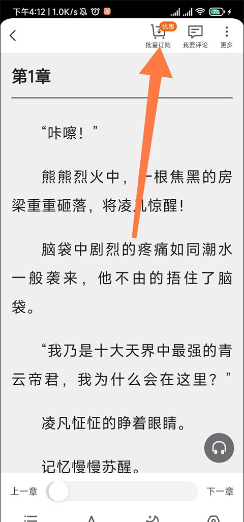 3、进入阅读界面我们随机点一个地方,这个时候界面上下会弹出一些列表,跟着小编所标识的箭头看可以看见一个购物车样式的图标,这样就可以快了。
