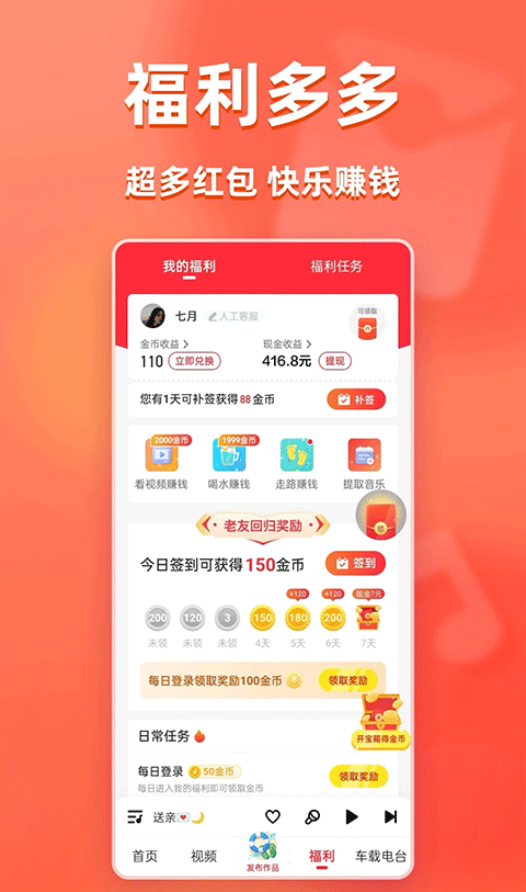 每天领取数十亿元红包,瞬间提现速度,十几项福利活动,让你边听边玩边挣钱!