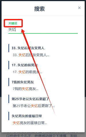 4、如果输入后“关键词”显示为绿色则表示为有效关键词,会自动显示匹配的小说,选择你想看的小说阅读即可;
