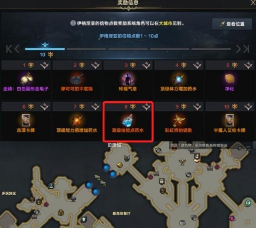 每将一个大陆大陆百科进度推到100%获得一个伊格涅亚的信物,收集满8个伊格涅亚的信物,在大城市兑换伊格涅亚的信物对应NPC位置可兑换一瓶高级技能点药水,位置在贝隆北部。