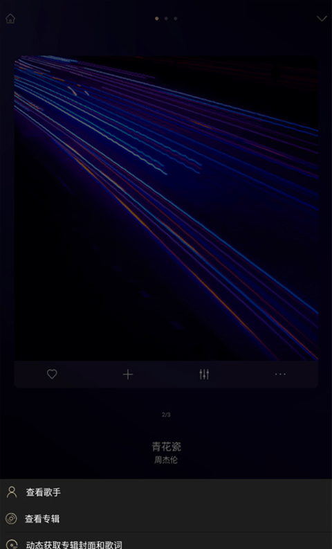 3、在播放界面中还有着均衡器、收藏、查看歌手、查看专辑、动态获取专辑封面和歌词;