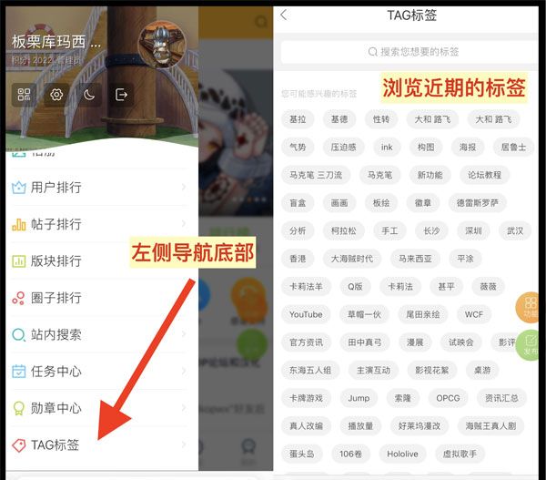 可以在首页左侧导航页,划到底部点击“TAG标签”来浏览近期的标签~