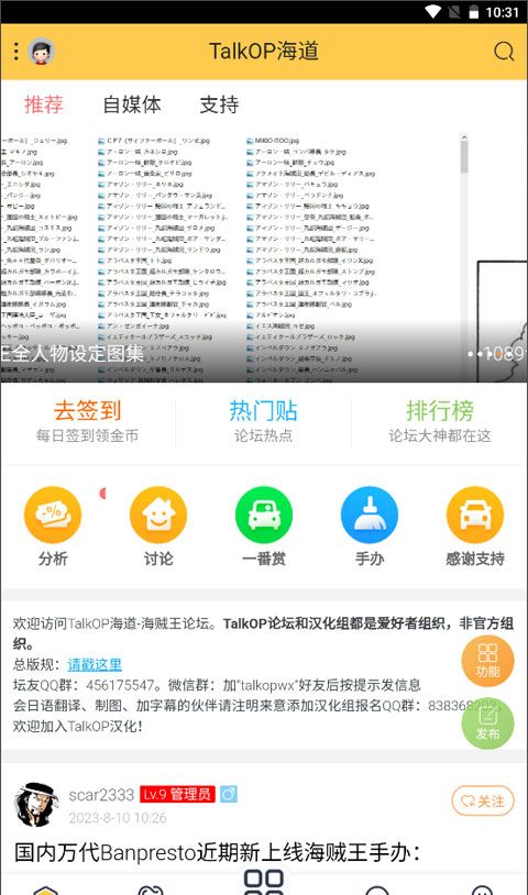 4、TalkOP汉化区:【TalkOP汉化组】作品发布区包括除各类版权漫画外的各类周边文字、图片、视频。(本区禁止一切侵权出版物。该区域仅限于公益交流,广告展示关闭,以消除所有盈利可能性。所有内容严禁用于任何盈利的商业用途!!大部分都是独家中文内容,真的让海迷受益匪浅!)