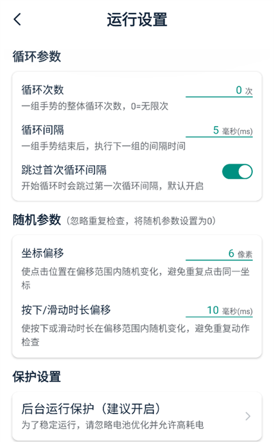 2.在运行设置界面,这里你能设置循环次数、循环间隔、坐标、偏移距离等参数。