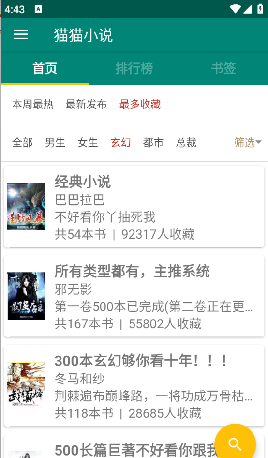 猫猫小说内置的小说资源非常的多,无论是言情、悬疑还是都市等类型都有,所有的小说资源都是免费阅读的,满足不同用户的需求,小说还可以进行收藏、下载和分享,小说资源及时更新,告别书荒,还会根据用户的阅读偏好智能准确地推荐小说。