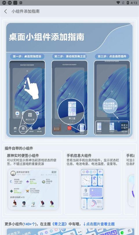 青之蓝是一款系统主题美化插件,软件中包含了各种各样的主题资源,针对不同的风格可以进行相应的分类,表达自己内心的情感主题。同时相比起之前版本,新增支付宝、微信的常用功能入口、新增原神实时便签和小组件,可在桌面实时显示原神当前的游戏资源,同时还支持加入可自定义的高斯模糊背景,解决部分机型打开插件抖动问题,并且还支持让鸿蒙所有应用都支持流转,优化插件启动速度,由原来的冷启动15秒提升为0.4秒左右,性能提升80%等,可以为用户带来更好的体验感!