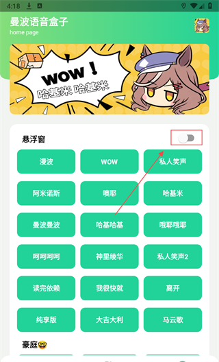 漫波语音盒子有游戏爱好者很喜欢的赛马娘语音包,语音盒子中有私人笑声,哈基米,广西大诗,大吉大利,马云歌等语音包,全部在悬浮窗中展示,语音包都很高级,赛马娘二次元角色的哼唱语音包都有,点击赛马娘语音包就会发出声音,欢迎下载去使用。软件之中可以选择贵族够用的语音播放功能,试着收听预览每一个语音包,都有不同的发现,每个语音包发出的声音完全不同,都让用户感到惊喜和意外。