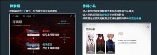 (1)探索期中含有多个区域,分为重灾区和低浓度区。作战小队进入章节时需要根据章节类型选择作战小队成员,进入探索后只能在安全区节点更换阵容,探索期内成员只能在安全区或触发特殊事件回复生命值。