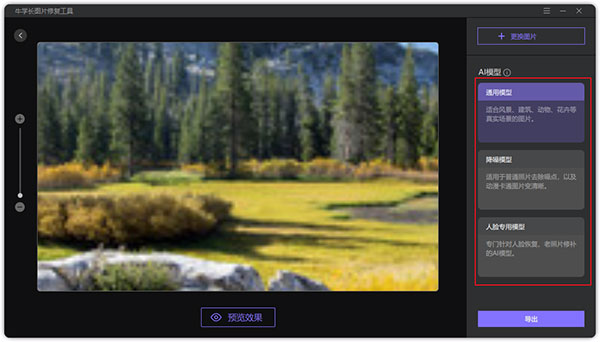 3、在右侧挑选合适的 AI 智能修复模型,点击 “预览” 开始修复,等待几秒处理。