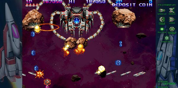 游戏采用2D光栅技术还原90年代街机美学,新作《沙罗曼蛇III》以细腻手绘呈现熔岩洞窟、机械要塞等经典场景,粒子特效强化了爆炸与光束的视觉冲击。动态天气系统如雷暴干扰弹道、陨石雨改变战场地形,增强沉浸感。主机版支持4K分辨率与60帧高刷,PS5版通过触觉反馈手柄模拟战机震动,Switch版则优化为便携模式,确保多平台体验一致。