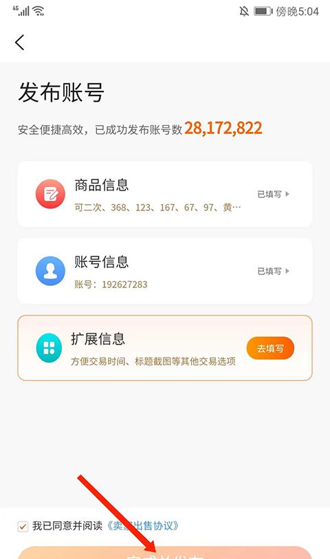3、依次填写完商品信息、账号信息和扩展信息后选择下方【完成并发布】即可进行发布出售,
