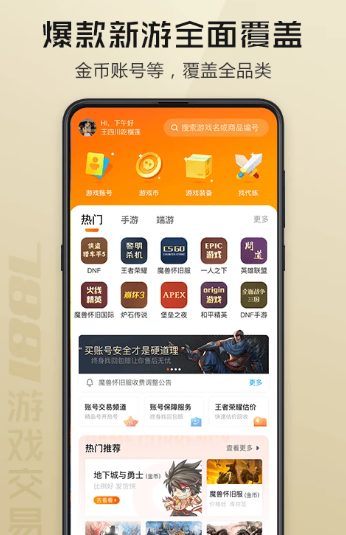 1、游戏交易应有尽有您可以随时选择DNF、魔兽世界、王者荣耀、英雄联盟等近百种游戏。