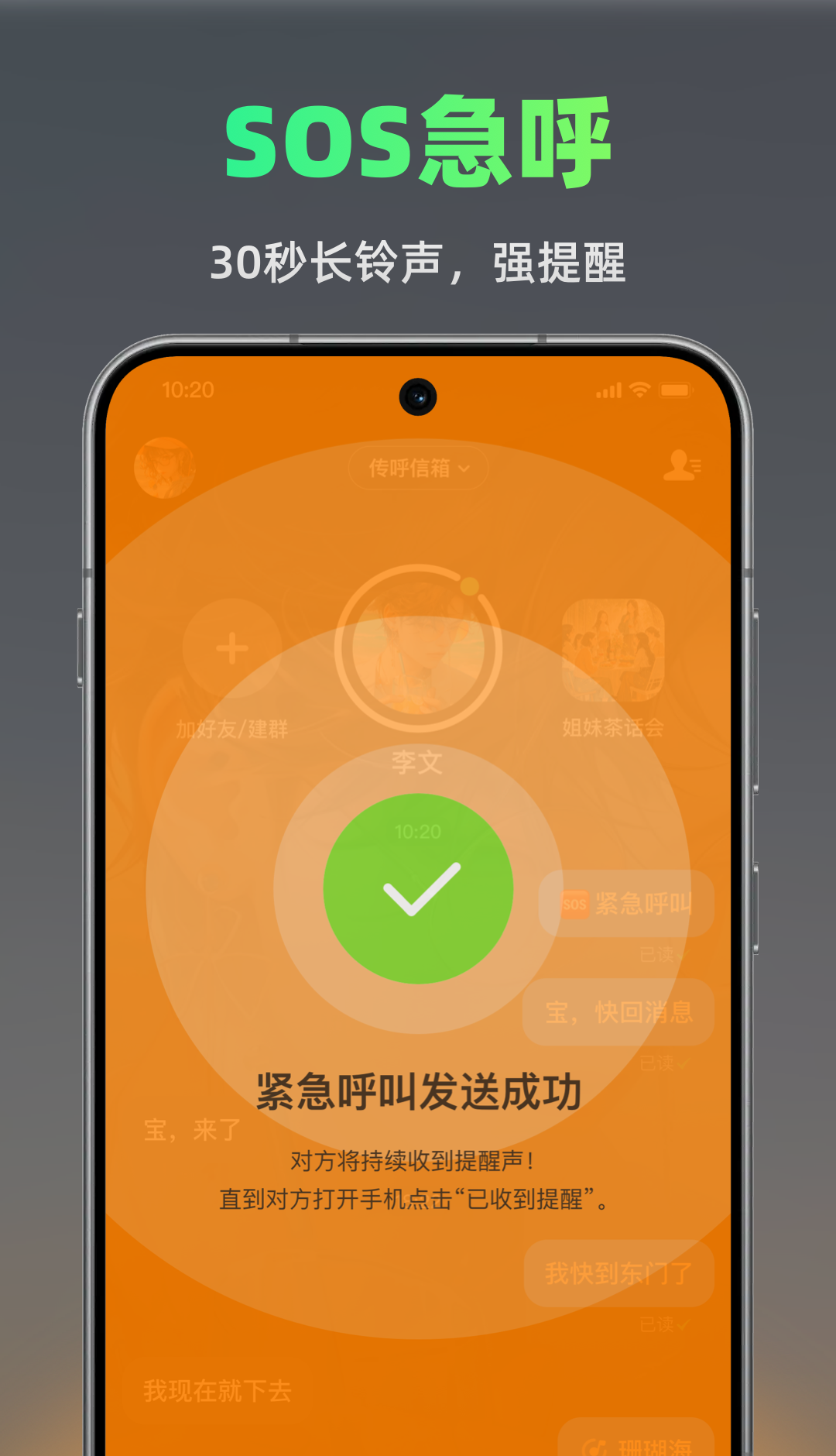 4、SOS模式自动激活最高优先级提醒,持续强提醒直到接收方确认消息。