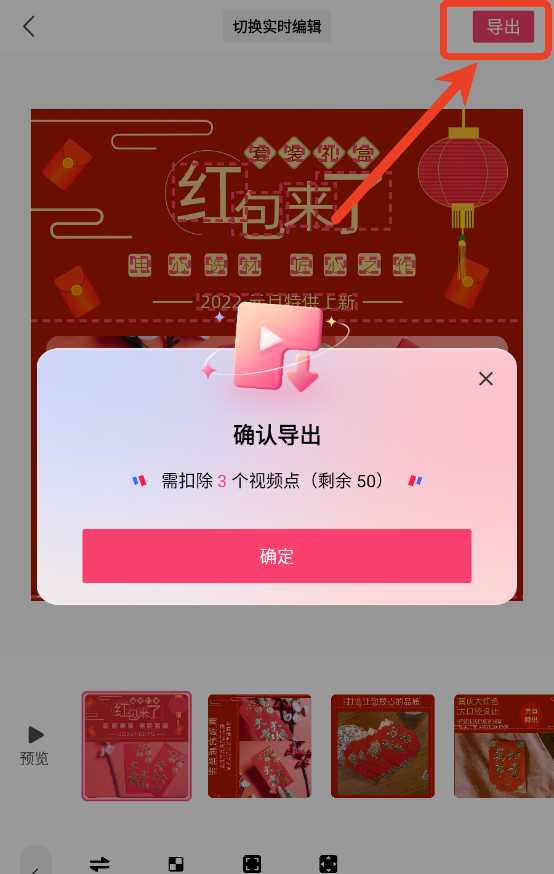 编辑完成之后点击右上角导出即可,会扣除3个视频点。
