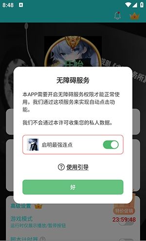 启明最强连点器app是一个有用的手机点击工具。无论是点击次数、频率还是持续时间等,所有功能都是免费的。无论是看视频、抢票还是翻页小说等,都能满足不同用户的电机需求,提高用户的使用效率。支持自定义点击频率、持续时间和次数,适用于视频观看、抢票、翻页等场景,有效提升运营效率,满足多样化需求。界面简单流畅。给用户的游戏和工作都带来便利。