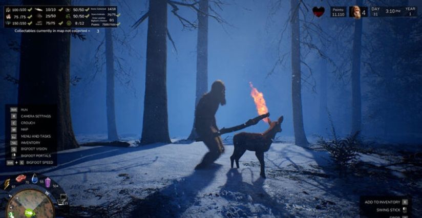 通过折断树枝、惊吓野生动物等方式获取额外积分,并逐步解锁强大的大脚怪技能,例如野兽视觉、高速奔跑、攀爬能力以及制造迷雾的特殊能力。但要小心人类猎人,他们会追踪你的踪迹,试图拍下你的照片来证明你的存在。潜入他们的营地,偷取物资,不仅可以获得积分,还能帮助你完成各种任务。