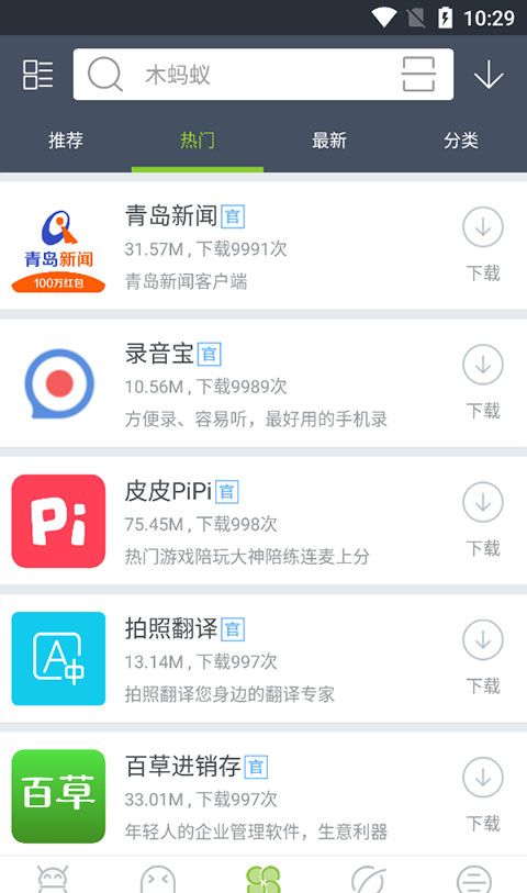 木蚂蚁应用市场是一款专为安卓手机用户打造的应用、游戏下载平台,应用提供全网最新的汉化安卓游戏与应用软件供用户免费下载,内置一系列手机管理功能,如优化系统设置、卸载内置应用及清理系统垃圾,采用断点续传及多线程多服务器集群技术,确保高速稳定的下载体验,总之,木蚂蚁应用市场不仅是一个强大的应用下载平台,还提供了丰富的手机管理和优化功能,旨在为用户提供全面、便捷、安全的安卓应用体验!