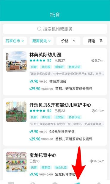 5、托育栏目提供幼儿园与照护机构信息,支持筛选距离、价格等条件便捷查找。