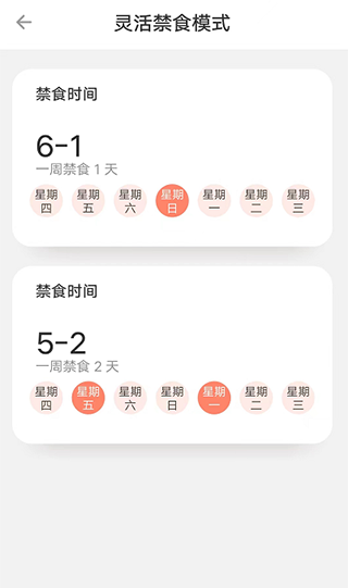 4、【灵活禁食模式】是根据自身情况来设定在一周内的一天或是两天卡路里摄入量不超过500,【灵活禁食】页面显示如下: