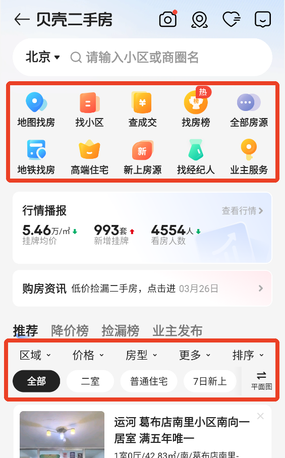 1、通过搜索栏、首页选项或者下方分类找到你想要看的二手房。