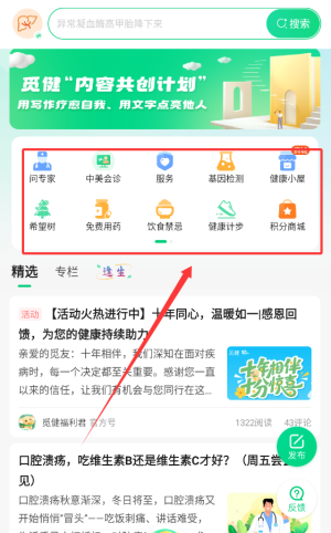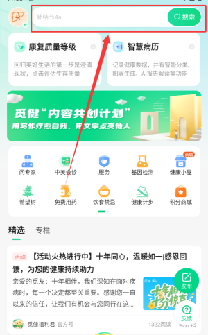 1、首页顶部的搜索框支持直接输入关键词,查询相关疾病的详细资料与科普文章。