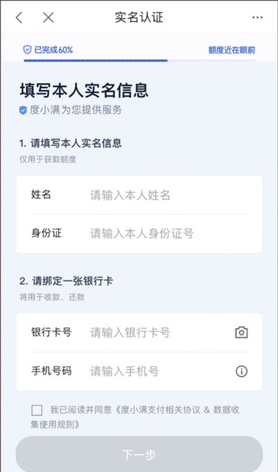 然后再点击[ 查看我的额度 ]-[ 实名认证 ]填写本人实名信息,即可查看您的借款额度。