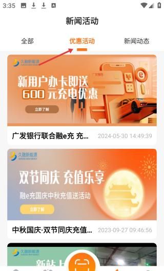 3、点击优惠活动分区,有新用户办卡优惠等内容,为用户提供充电福利,便于获取优惠信息。