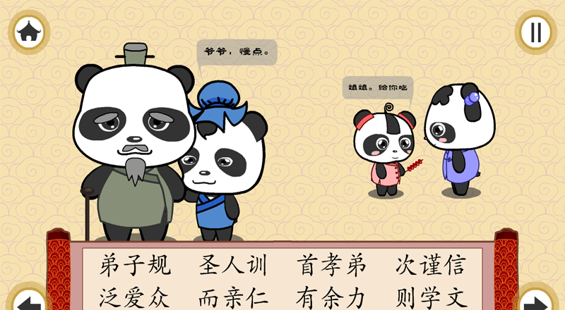 熊猫乐园弟子规是一款为学龄前儿童打造的早教平台,平台为孩子提供了经典的国学弟子规,通过动画的形式演绎弟子规的各种场景内容,让孩子可以通过软件轻松的进行学习,这样就可以对孩子进行早教启蒙,而且还可以观看非常有趣的动画,让学习更加的轻松。还提供了许多有趣的场景互动,通过各种趣味互动,可以增加孩子的学习记忆效果,让孩子可以记住学习过的内容。