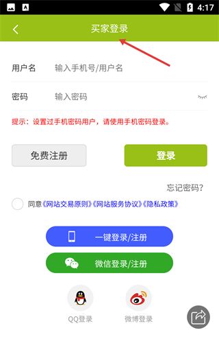 3、买家登录页,用户输用户名密码,勾选协议可登录,有免费注册等多种方式,有忘记密码入口。