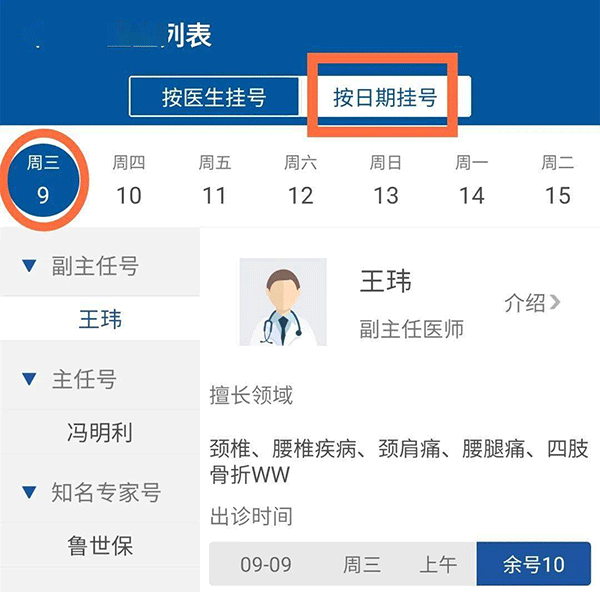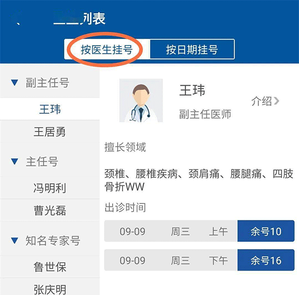 2、在“首页”点击“预约挂号”,选择科室后,进入“医生列表”,可按医生挂号;