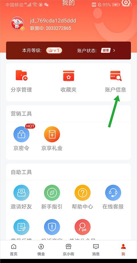 1、用户可以打开并登录京粉app,前往【佣金】页面中点击【提现】后。