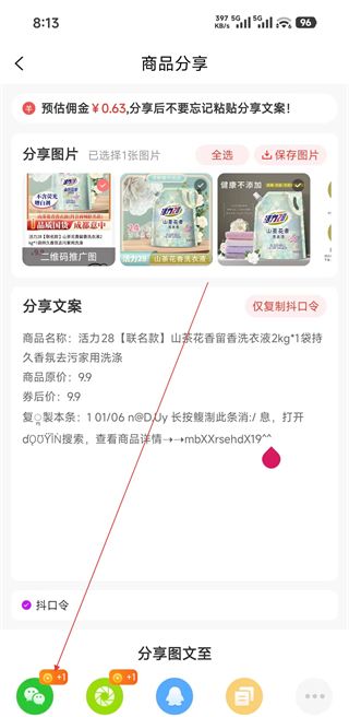 4、在商品分享页面选择分享图片或文案,复制相关内容,再选微信好友等渠道,完成商品分享。