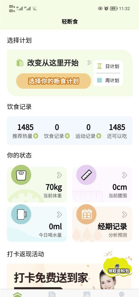 1、智能推荐:根据用户的身体状况和减肥目标,智能推荐个性化的每日热量摄入和禁食计划。