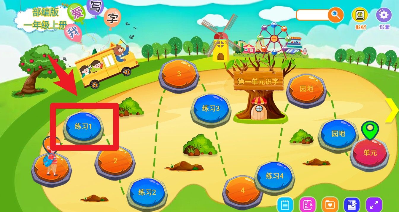 1、进入首页后,选择相应的年级章节,点击练习1等等级按钮,即可进入当前单元的学习任务。