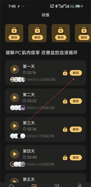 3、进入培训页面,找到第一天的培训内容,点击相应的解锁按钮,即可解锁培训项目。
