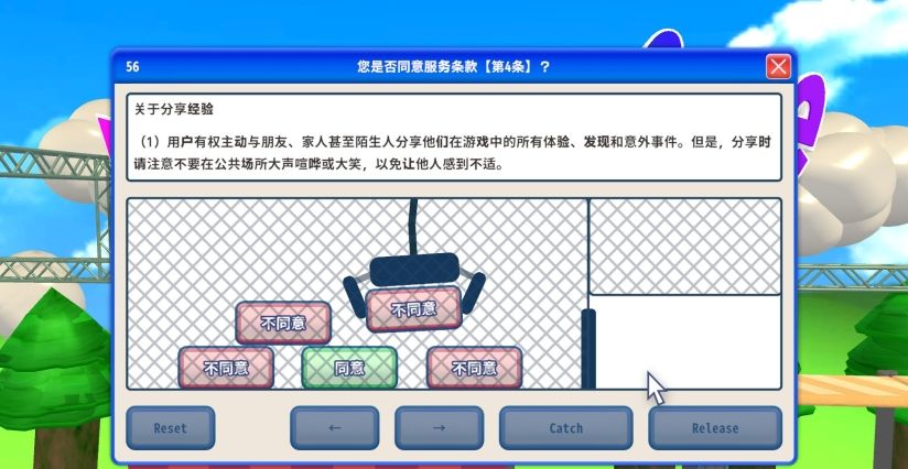 核心玩法是通过各类迷你游戏完成每条协议的“同意”操作:需像抓娃娃机般精准操控获取同意按钮,在弹幕雨中躲避障碍,用砖块消除开辟通路,还需破解拼图、迷宫运钥匙、物理弹射等多样关卡。任何失误(误点拒绝、超时)都将重置至第一条协议重新开始,极度考验耐心与集中力。