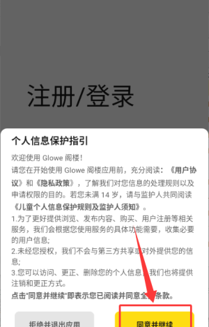 1、点击Glowe阁楼中的“同意并继续”进入注册和登录界面。