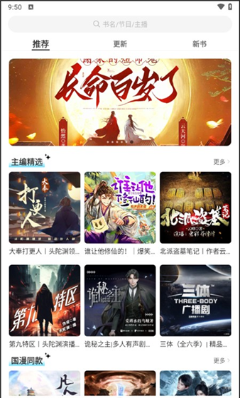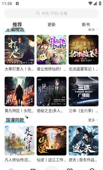 2、主页有明确的分类,如推荐、更新和新书,涵盖了有声小说、相声、广播剧和音乐等多种类型。流行小说很容易满足不同用户的不同需求。
