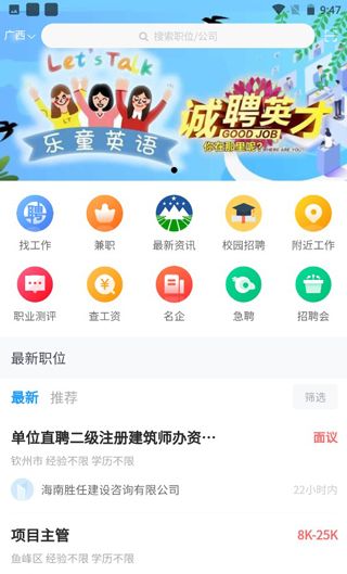广西人才招聘网是一款非常好用的求职找工作软件,拥有丰富多样的职位信息可以实时更新,方便用户轻松进入首页中浏览查看,自由找到满意的工作职位,还具有同城职位功能,随时随地轻松为用户显示当前城市的最新工作职位,自由享受优质的求职找工作服务,还拥有个性化的界面设计,用户可以轻松咨询HR来进行面试咨询,能完全满足所有使用需求,还提供全面的简历制作功能,随时让用户轻松制作各种精美的简历。