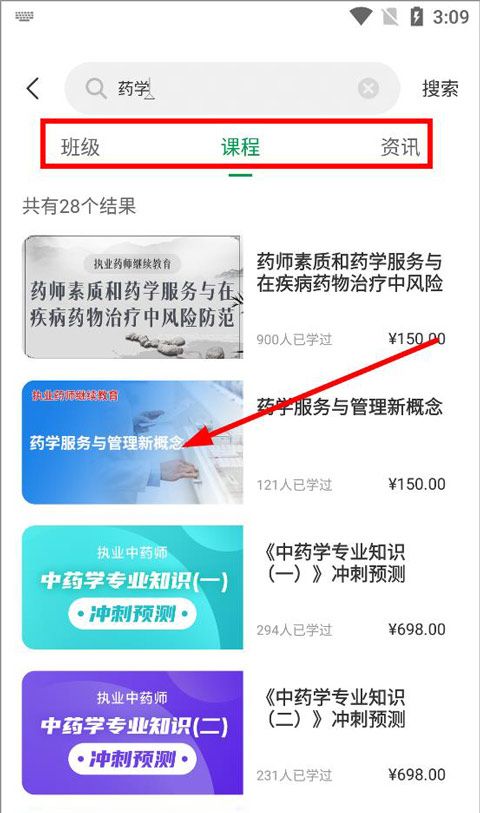 2、搜索关键字后,您可以查看相关的考试辅助课程、专业课程以及相关的新闻信息。点击班级/课程进入注册页面。