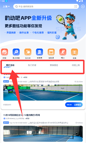 韵动吧是一款热门的网球运动社区软件,拥有全新的首页设计,用户可以直接进入来搜索查找当前城市的网球场地,随时随地在线预订,自由享受优质的运动服务,还能实时更新各种运动活动,允许用户自由选择参加来寻找运动搭子,轻松提升运动兴趣,能完全满足所有使用需求,还提供全面的运动社区,用户可以自由选择加入各种运动,自由体验精彩的运动锻炼过程,还能轻松咨询客服,轻松帮助用户解决各种问题。