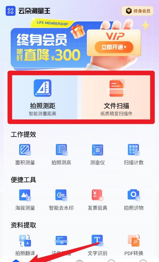1、进入主页后,您可以选择照片测距功能或文件扫描功能。前者用于测量物体之间的距离,而后者可以将纸质文件转换为电子文档。
