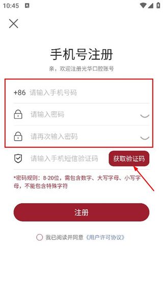 2、在帐户注册页面上输入您的电话号码和密码后,单击“获取验证码”按钮。