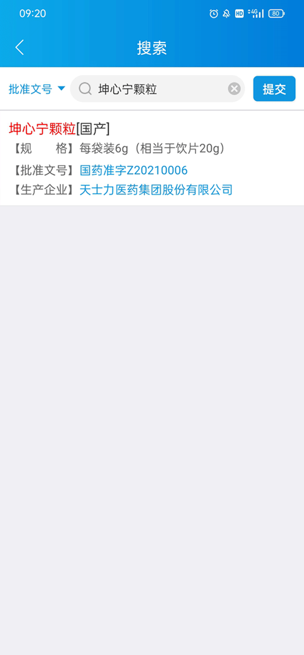3、输入您要查询的药物,我在这里输入了昆心宁颗粒,点击右侧的提交。
