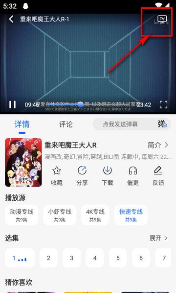 3、打开想投屏观看的视频,然后点击右上角如图所示的投屏按钮.